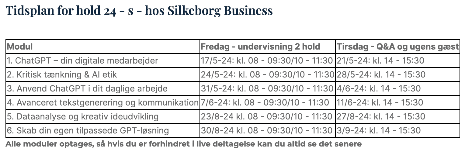 Kom med på uddannelse i ChatGPT over 6 moduler – se datoerne nedenfor. Sammen med Be Better Academy tager vi dig igennem en praktisk tilgang til at bruge ChatGPT.